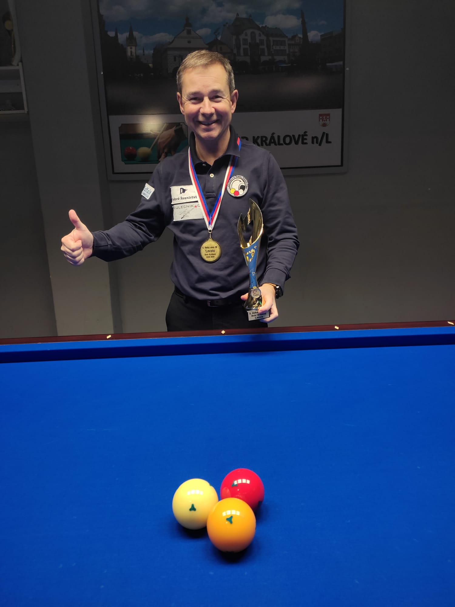 Pouze dva vítěze zná letošní seriál Velkých cen v trojbandu na velkém stole. V pořadí pátý turnaj vyhrává Radek Novák. Vítěz tří turnajů a vedoucí hráč seriálu Radovan Hájek ve Dvoře Králové nad Labem nehrál. Radek Novák navázal na listopadovou výhru ze Žižkova. Ve finále porazil ostravského hráče Stanislava Masára 35:21 na 27 náběhů. Radek byl na turnaji nejlepším hráčem. Zahrál jasně nejvyšší generální průměr 1,197. V celkovém pořadí seriálu se posunul na druhé místo. Na Hájka ale ztrácí před posledním šestým turnajem, který se odehraje o Velikonocích na Kladně, 20 bodů.